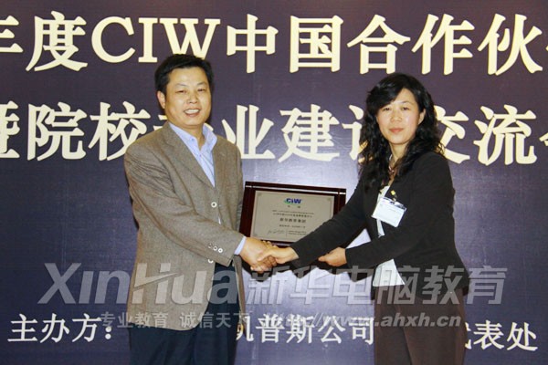 CIW中國區(qū)總經(jīng)理鄭欣女士為安徽新華電腦專修學院頒“金牌合作院校獎”