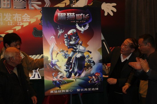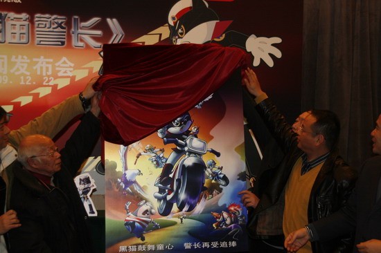 12月22日下午,在眾多國產經典動畫片誕生地的上海美術電影制片廠,舉行了“2010年春節(jié)檔:最新影院片《黑貓警長》新聞發(fā)布會”。發(fā)布會現場,出品方代表上影集團副總裁汪天云,主創(chuàng)代表《黑貓警長》之父、新版影院動畫片總導演戴鐵郎等與數十家媒體記者濟濟一堂,回顧經典,共賞新意,主旨在于通過新編影院動畫片《黑貓警長》復活優(yōu)秀國產經典動畫作品及形象,喚起70后、80后的集體記憶,并使新一代觀眾通過《黑貓警長》情節(jié),展現國產優(yōu)秀動畫作品的不朽風采。發(fā)布會上,揭幕了最新影院片《黑貓警長》首款海報。