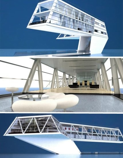水上屋(House on the Water)并不是面向鐘情于海洋的人的出租房,用于享受美妙的海上生活,而是一種懸臂結構現(xiàn)代生態(tài)友好型住宅,所需能量由太陽能和潮汐能提供。水循環(huán)和脫鹽、自然通風以及高科技遮陽系統(tǒng)均由電腦控制,所有這些不過是水上屋的冰山一角。水上屋專為希臘查提島西北海岸的地中海海域設計,采用鋼筋混凝土結構,表面被漆成具有典型希臘風格的純白色。