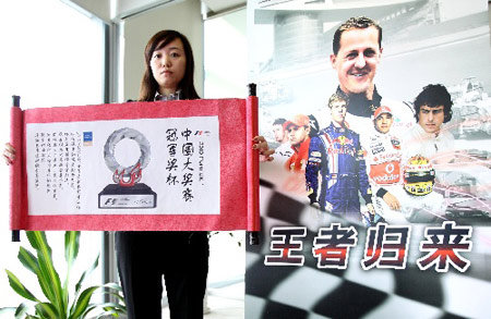 3月2日,2010年F1中國(guó)大獎(jiǎng)賽冠軍獎(jiǎng)杯設(shè)計(jì)在上海亮相。獎(jiǎng)杯由環(huán)狀造型和火焰構(gòu)成。設(shè)計(jì)靈感來(lái)自于中國(guó)古典神話(huà)中的人物“哪吒”的兵器。此外,環(huán)狀造型連接底座的抽象化火焰象征了疾馳中F1賽車(chē)高速旋轉(zhuǎn)的車(chē)輪與賽道表面摩擦出的星星火焰。